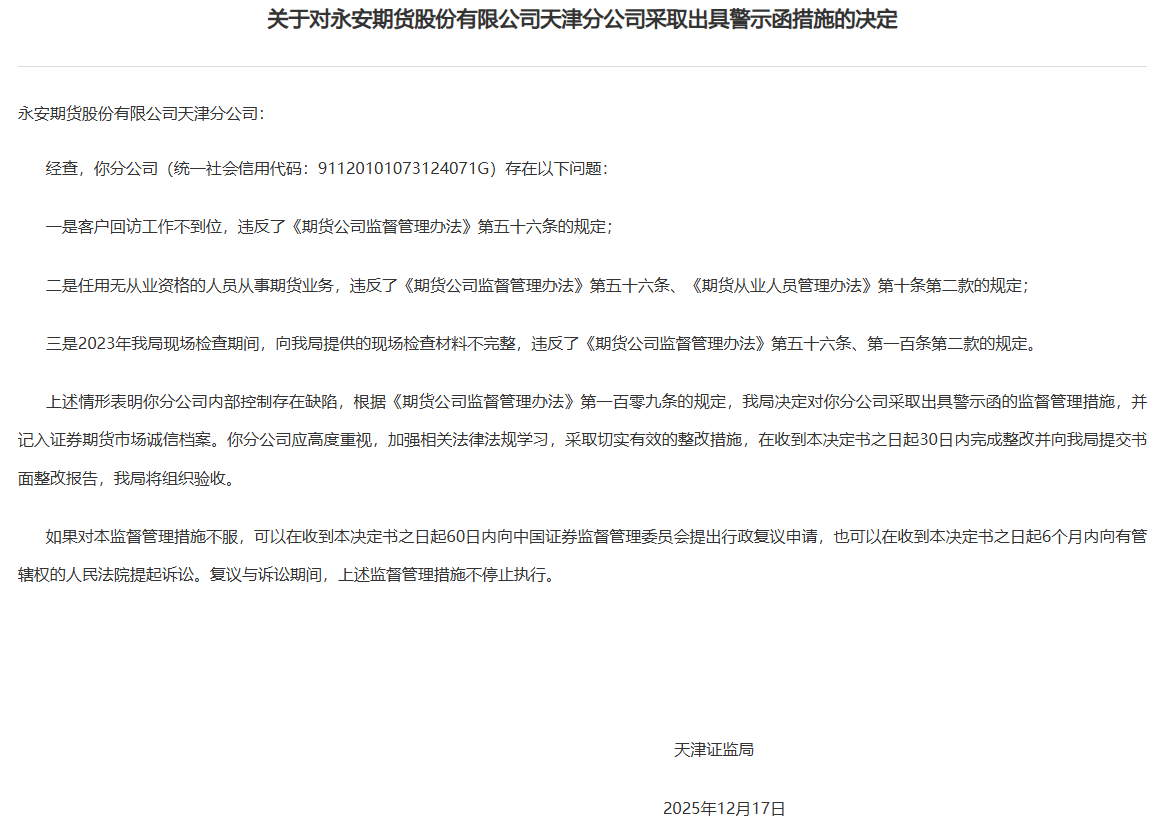 中国经济网北京12月24日讯 中国证监会天津监管局网站近日公布关于对永安期货股份有限公司天津分公司采取出具警示函措施的决定。