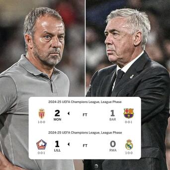 ✓皇马0:1里尔,欧冠连续14场不败遭终结;上一轮法甲摩纳哥2:1击败巴萨;
